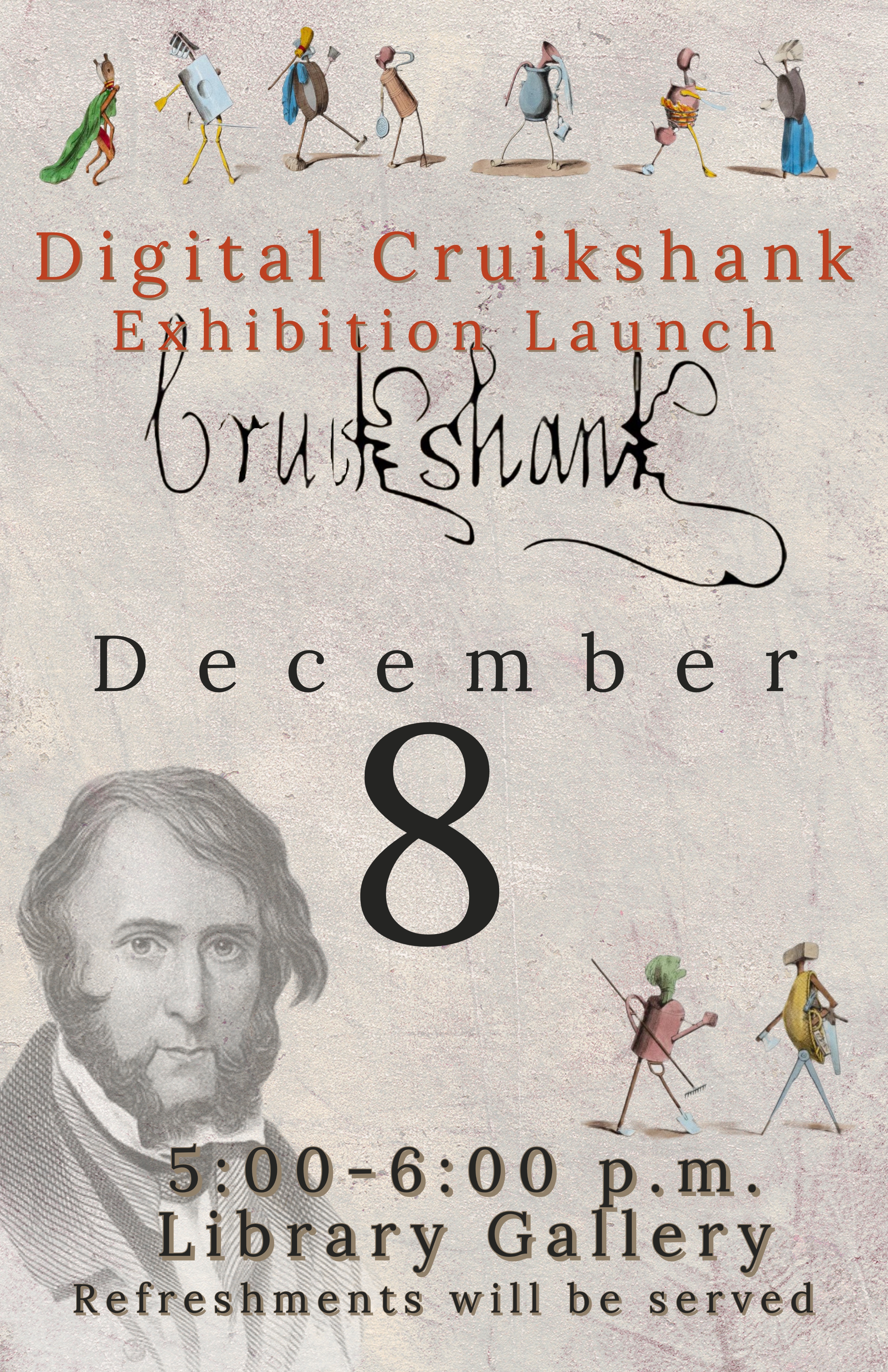 The students from Dr. DiCuirci's English 416/616 course invite you to an exhibition launch for their online exhibit, Digital Cruikshank, on Thursday, December 8 from 5:00-6:00 p.m. in the Albin O. Kuhn Library Gallery.