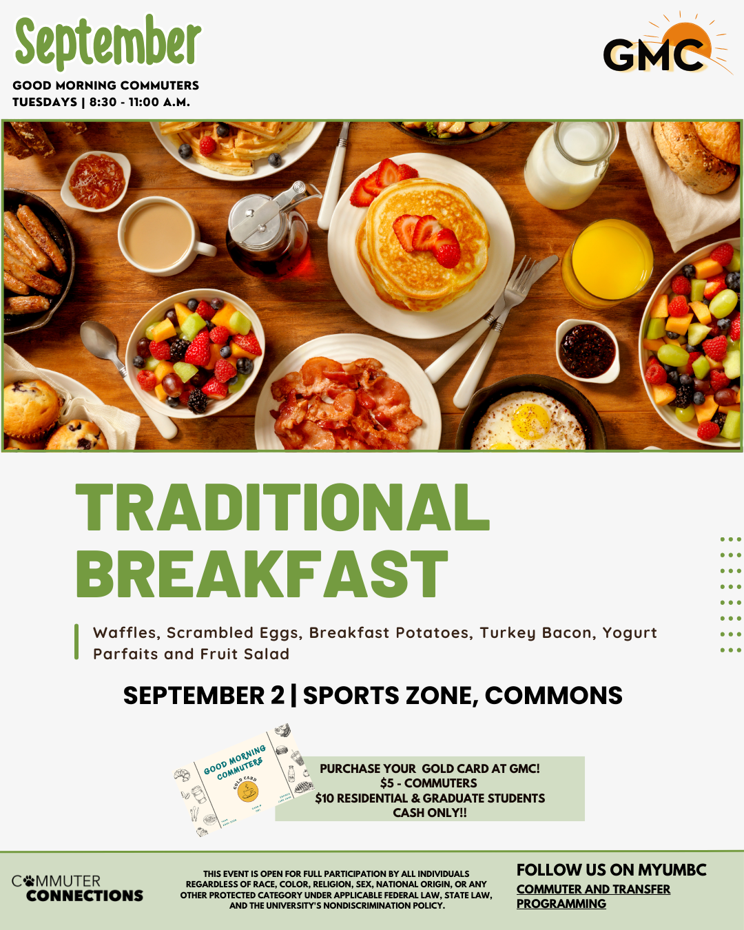 Enjoy breakfast with other UMBC commuters and get connected with on-campus resources! There isn't a better way to start your day!