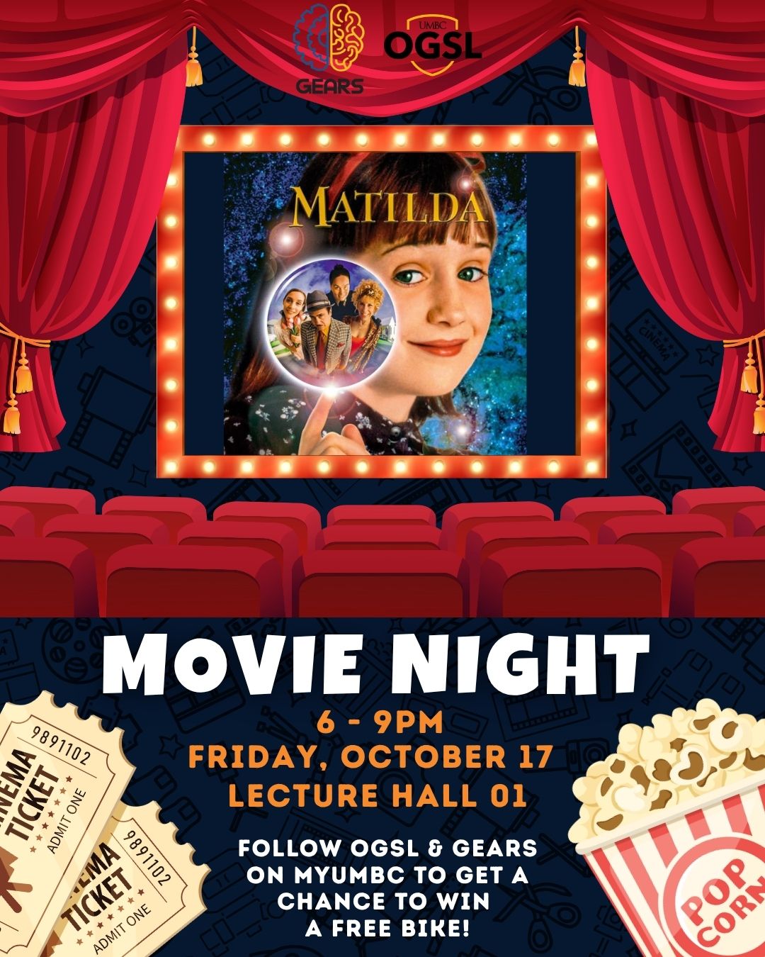 Join OGSL for a cozy Movie Night filled with free popcorn, pizza, and a bike giveaway!n To enter, just follow OGSL and GEARS on myUMBC and attend Movie Night for your chance to win.