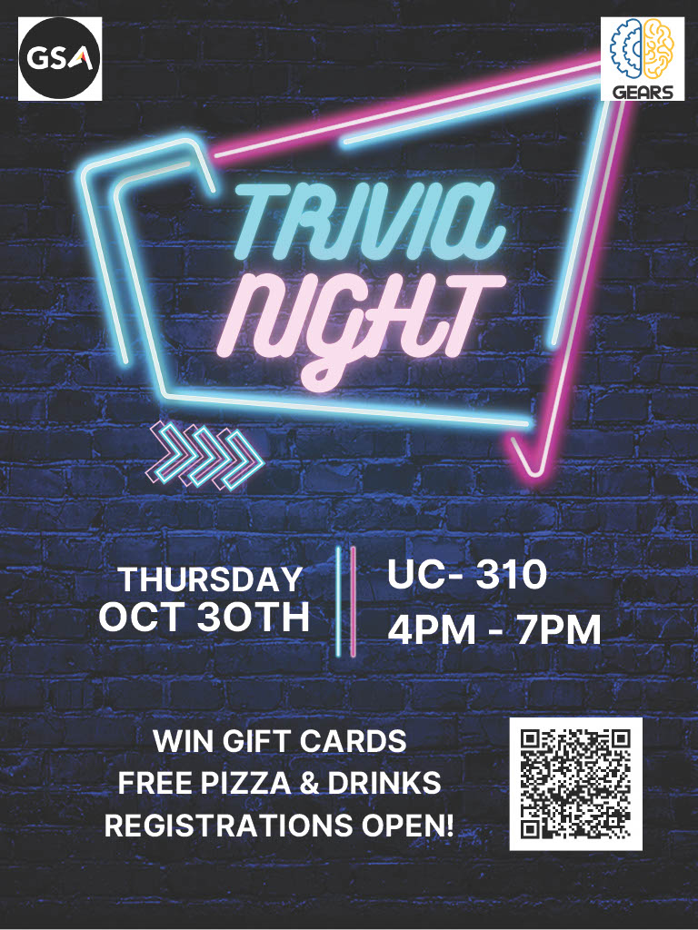 GEARS is hosting a Trivia Night, where you can challenge your knowledge, compete in teams, and win exciting gift cards (each member of the winning team will receive a $50 gift card)!