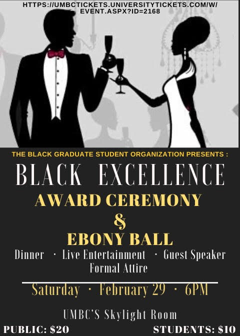 The Black Graduate Student Organization is hosting the inaugural "Black Excellence Award Ceremony and Ebony Ball" on Saturday, February 29, 2020 at 6PM.