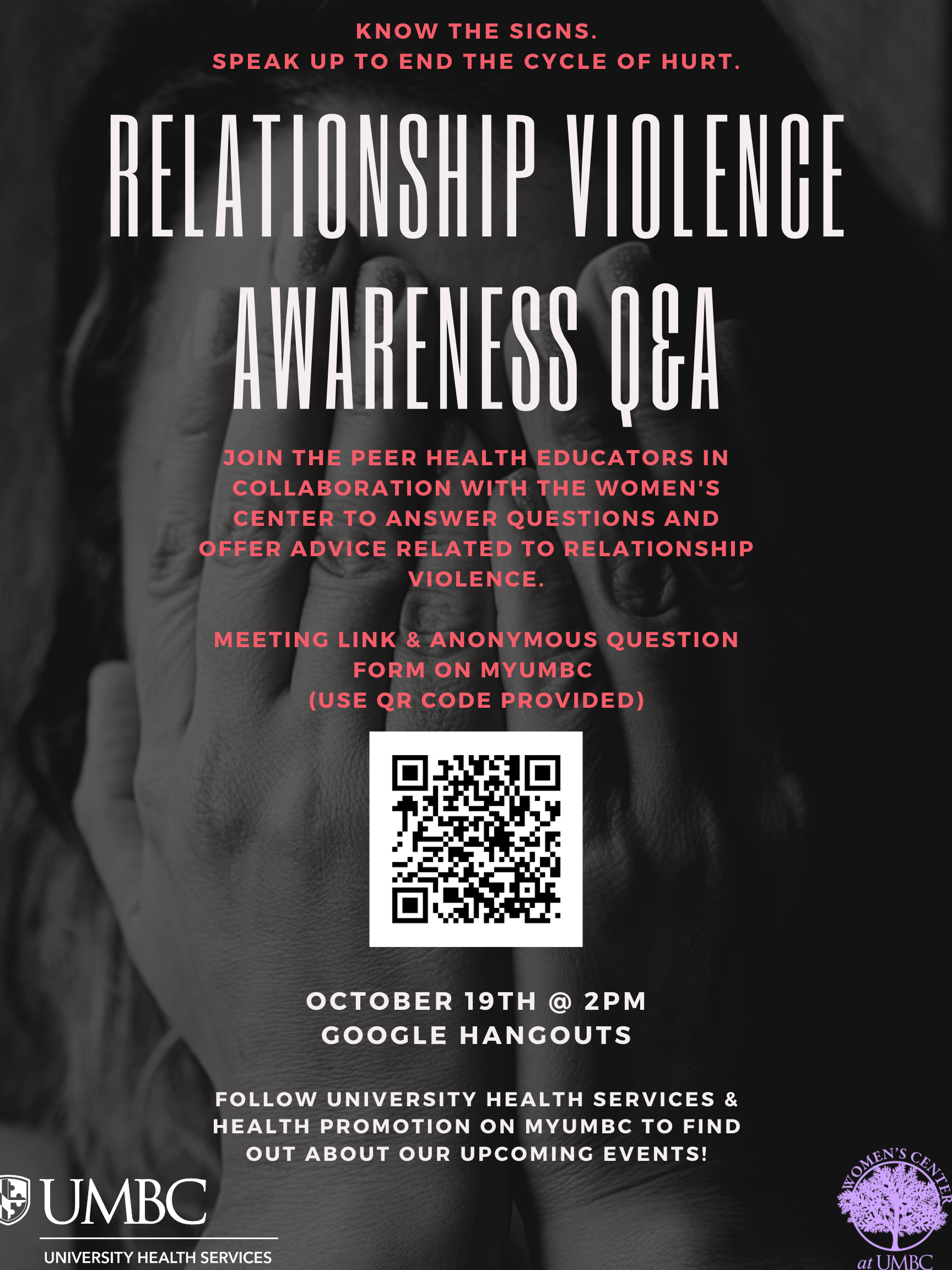 In honor of National Domestic Violence Awareness Month, the peer health educators will be hosting a Q&A about intimate partner violence with the Women's Center.