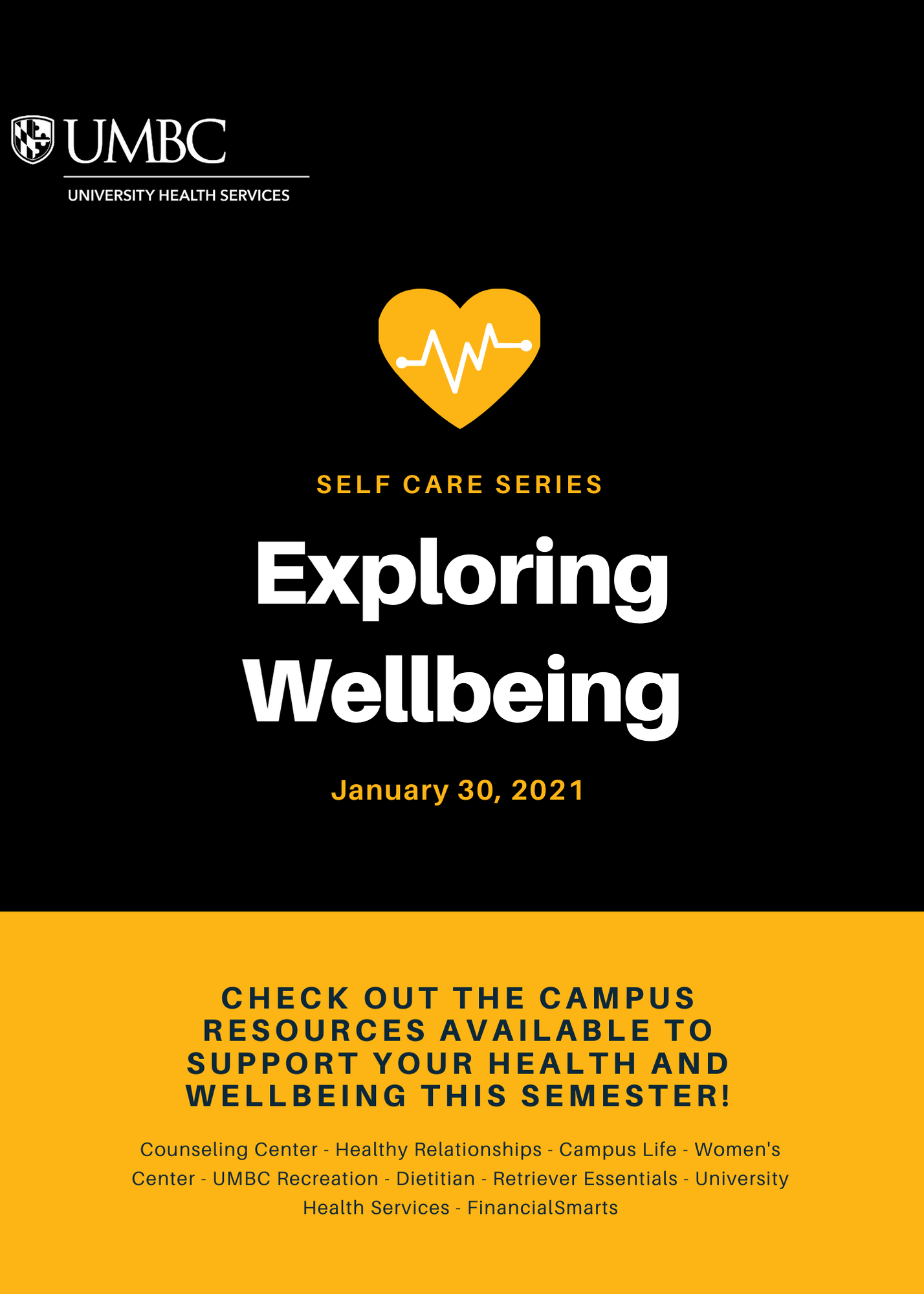 Check out the campus resources available to support your health and well-being this semester! Follow @umbcuhs on Facebook, Twitter, or Instagram to learn more about our services, programs, and events.