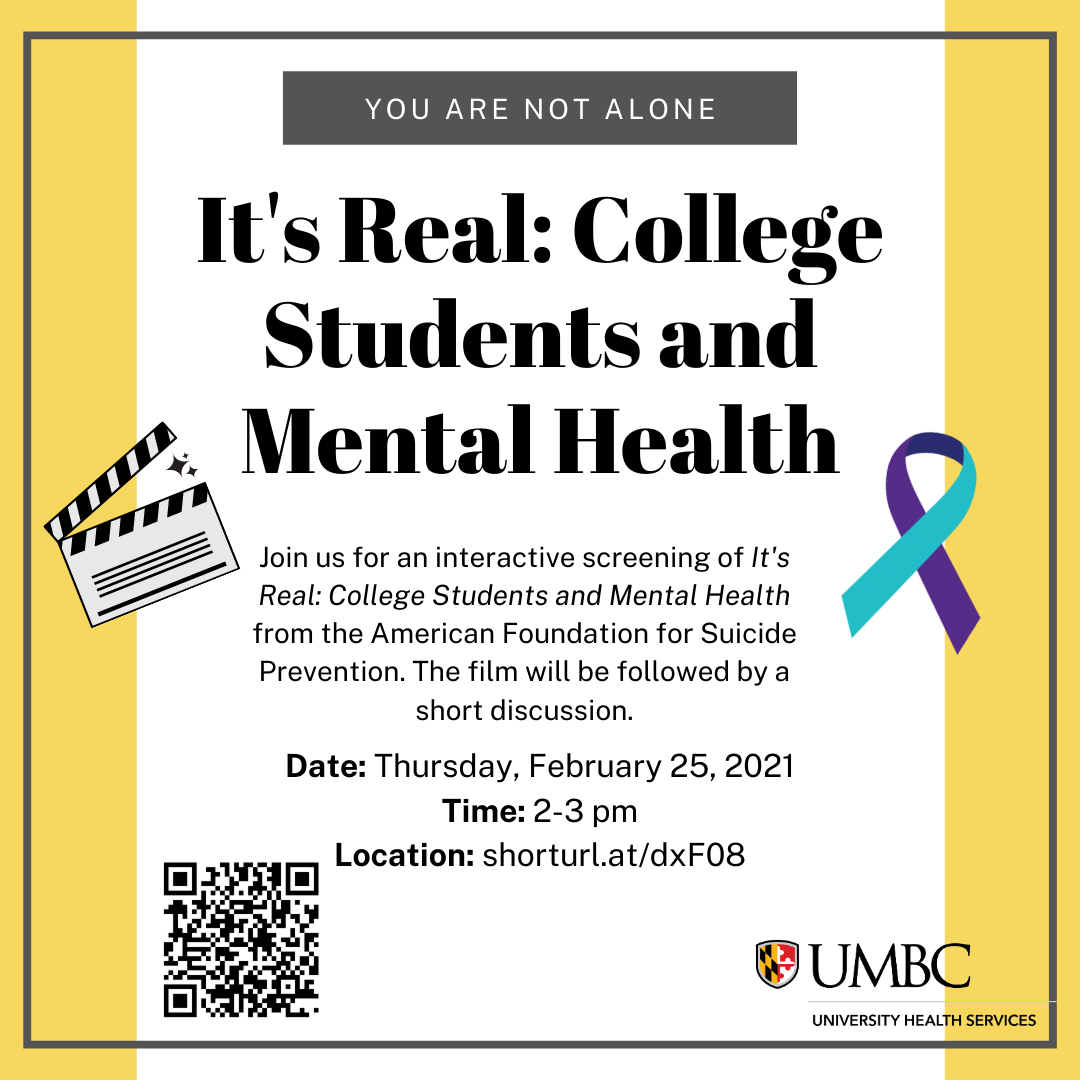Join us for our interactive screening of It's Real: College Students and Mental Health from the American Foundation for Suicide Prevention. The film will be followed by a short discussion.
