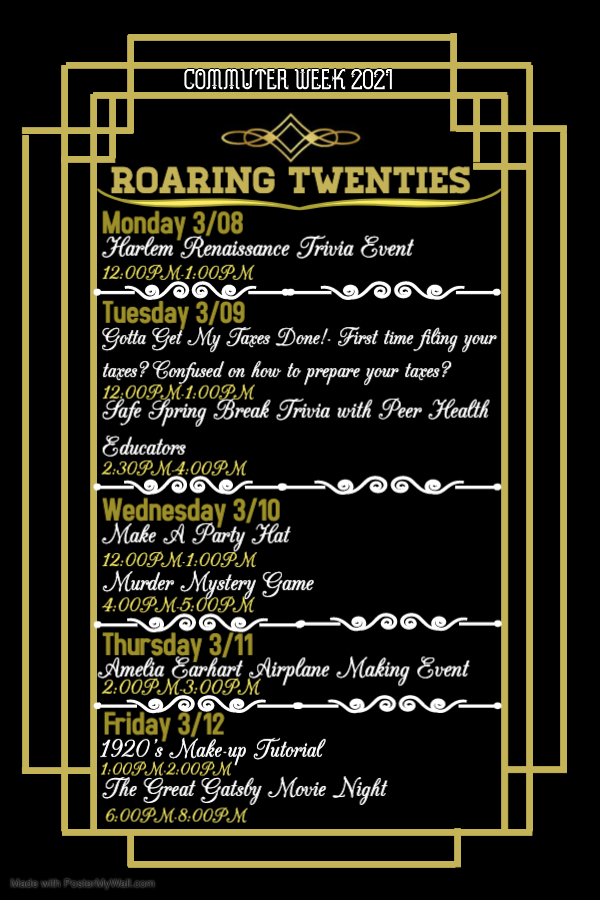 From March 8th-12th we have some great 1920s inspired events planned! You will also have the chance to win prizes and meet new friends! See all the events in the flyer attached below.