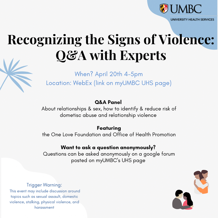 Join us for a Q&A panel about relationships and sex and how to identify and reduce risk of relationship abuse and violence. Special guests from the One Love Foundation, Women's Center, and Office of Health Promotion!