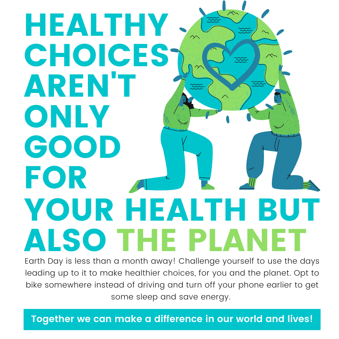 Earth Day is April 22, less than a month away! That's why we are challenging you to make conscious choices not only to improve your physical health but also that of our planet. This could mean simply taking a walk outside and cleaning some trash along the way, biking somewhere rather than driving, or going to bed early to give both your eyes and energy bill a break.