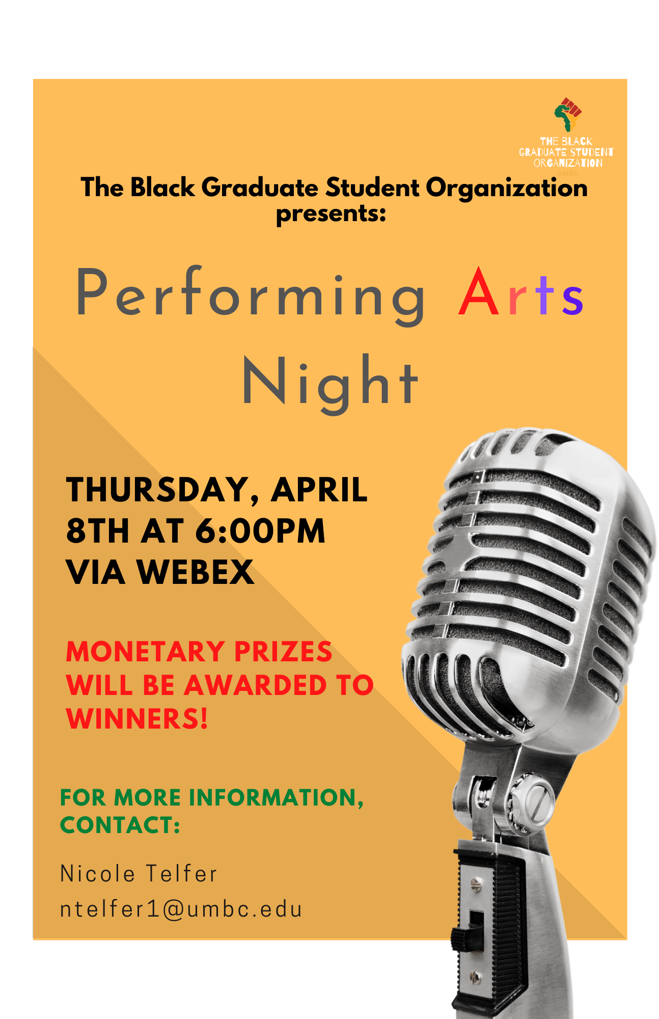 UMBC graduate students are encouraged to participate in this performing arts event! They can do poetry, sing, dance, or anything else within the realm of the arts.